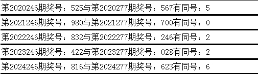 与前期历史同时奖号对比分析,在最近五年开奖中,第246期同时奖号与第277期同时奖号王人出现了雷同号码: